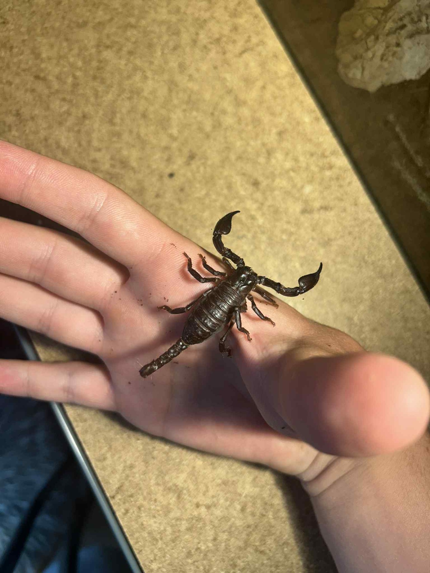 Krmím ho šváby, cvrčky a červy. Je důležité dohlédnout, aby štír potravu sežral, a aby mu nezpůsobila problém při svleku.
